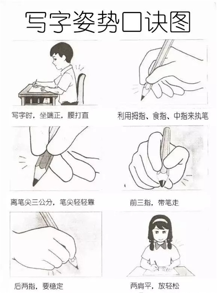 端正自己的坐姿并规范自己的握笔方式,这两项非常重要,也是我将他们放在位的原因,错误的坐姿和不规范的握笔方式不仅对汉字的书写有不好的影响,也会造成近视、驼背等很多的后遗症。